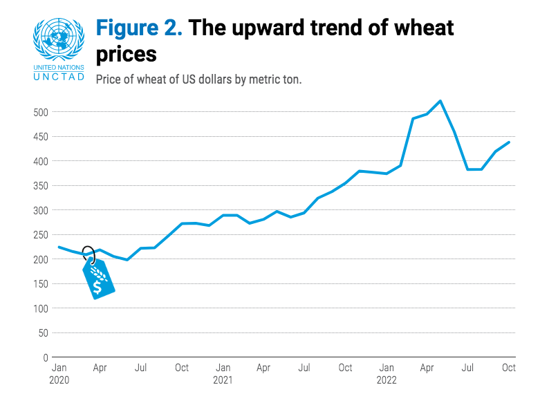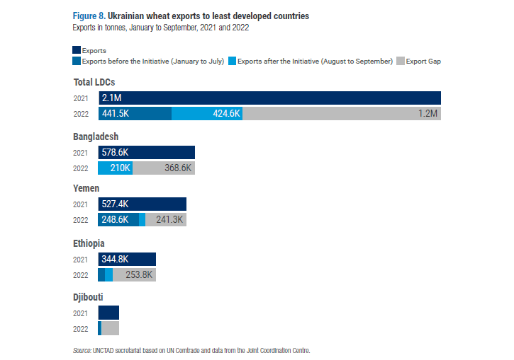 10- يضع تقرير مؤتمر الأُمم المتحدة للتجارة والتنمية الصّادر في أُكتوبر 2022م، كلاً من إثيوبيا وجيبوتي ضمن البلدان الأقل نموًّا في العالم، ومن بين أكثر البلدان في العالم تضرُّرًا من تأثر سلاسل إمداد القمح الآتية من أوكرانيا، ممّا يعني أن درجة تفاقم أزمة الأمن الغذائي (Food Security) وصولًا إلى حدّها الأقصى بانعدام الأمن الغذائي (Food Insecurity) قد باتت أمرًا واقعًا وليس فقط أمرًا وشيكًا من الممكن تحققه.