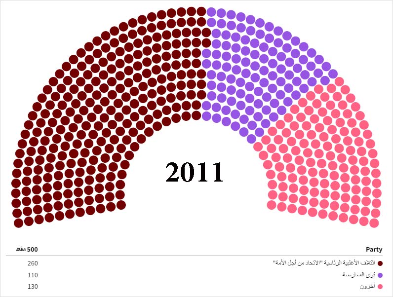وفي 2011م، تنافس 98 حزبًا سياسيًّا (من بين 428 حزبًا مسجلاً آنذاك)، و16 مرشحًا مستقلاً على التمثيل البرلماني، فاز منها 17 حزبًا بأكثر من خمسة مقاعد، ومن بين الأحزاب الـ81 المتبقية فاز 45 منها بمقعد واحد لكل، كما حصل الحزب الحاكم “الشعب للإعمار والديمقراطية” على 62 مقعدًا من بين 260 مقعدًا هي إجمالي مقاعد تحالف “الاتحاد من أجل الأمة” المؤيد للرئيس، بينما حصل حزب “الاتحاد من أجل الديمقراطية والتقدم الاجتماعي” على 41 مقعدًا ليصبح أكبر قوى المعارضة في البرلمان، والتي حصلت مجتمعة على 110 مقاعد، وبتلك النتائج، تَمكّن تحالف الحزب الحاكم من الحصول على الأغلبية المطلوبة في البرلمان([19].(