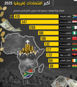 أظهر تصنيف جديد صادر عن صندوق النقد الدولي لأكبر اقتصادات إفريقيا عام 2025 أن دولة جنوب إفريقيا ستتصدر القارة بناتج محلي إجمالي يبلغ 410 مليارات دولار، تليها مصر في المركز الثاني بناتج 347 مليار دولار.