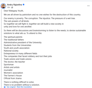 وقال راجولينا في رسالةٍ نُشرت يوم الثلاثاء على صفحة مكتبه على فيسبوك: “معًا، يجب أن نتحد لمحاربة هذه الشرور وبناء مجتمع جديد قائم على التضامن والاحترام المُتبادل”.