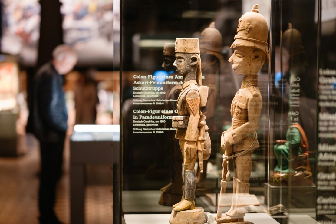 وفي بعض الأماكن في قاعات المعرض، لا يزال تمثال “هيرمان فون فيسمان” البرونزي ملفوفًا بلباد النقل، مما يُعطيه مظهرًا مُتضررًا. شُيِّد التمثال في دار السلام عام ١٩٠٩م، ونُقِلَ إلى ألمانيا عام ١٩٢١م، وأسقطه نشطاء طلابيون عام ١٩٦٨م. طريقة العرض إنما تُقدم صورة رمزية يتم تأطيرها أيضًا بأفلام وثائقية للتعبير عن المزيد من عمليات هدم الآثار الاستعمارية. كذلك يتجاوز المعرض، بشكل بديهي، الحواجز بين الأزمنة والأساليب والوسائط والتخصصات، ويعرض للزائرين صندوق مقتنيات أصلي به مقتنيات أثرية -تراث تاريخي كلاسيكي كالخرائط القديمة والكتب العتيقة والوثائق السياسية-، بالإضافة إلى مقتنيات فردية نادرة، مثل خزانة العرض الباروكية المهيبة لأحد هواة جمع التحف من سارلاند، المليئة بمنحوتات إفريقية صغيرة.
