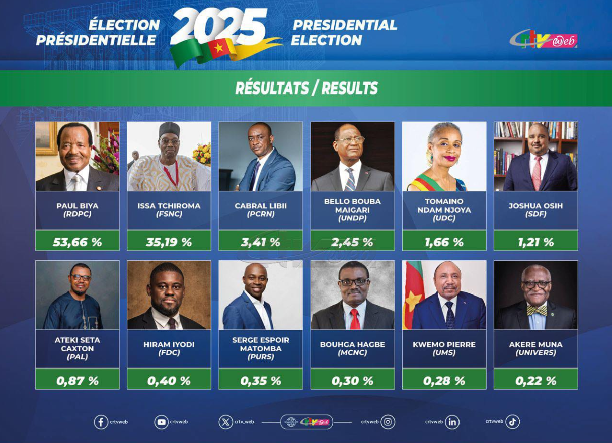 أعلن المجلس الدستوري الكاميروني برئاسة كليمنت أتانجانا يوم الاثنين الموافق 27 أكتوبر 2025 النتائج النهائية للانتخابات , حيث أعلن عن فوز الرئيس بول بيا بولاية رئاسية ثامنة , بعد حصوله علي نسبة 53.66% من أصوات الناخبين والتي تعادل نحو 2.47 مليون صوت , كما أضاف المجلس الدستوري أن الرئيس بول بيا فاز في العديد من المناطق الانتخابية الهامة ومن أبرزها موطنه في جنوب البلاد , ومنطقة الجنوب الغربي , ومنطقة الشمال الغربي , ومنطقة أقصي الشمال , ومنطقة الوسط , ومنطقة الشرق , بينما فاز منافسه الرئيسي عيسي تشيروما في منطقة الساحل , ومنطقة الشمال , ومنطقة الغرب , ومنطقة أداماوا , وفقا للنتائج الرسمية , وفيما يتعلق بنسبة المشاركة فقد أعلن المجلس الدستوري أنها بلغت 57.76% . ([13]) ويمكن عرض نتائج الانتخابات من خلال الجدول التالي :