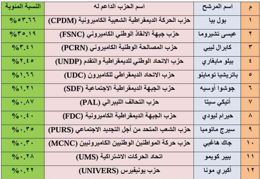 المصدر : من إعداد الباحث وفقا للنتائج التي أعلنها المجلس الدستوري الكاميروني