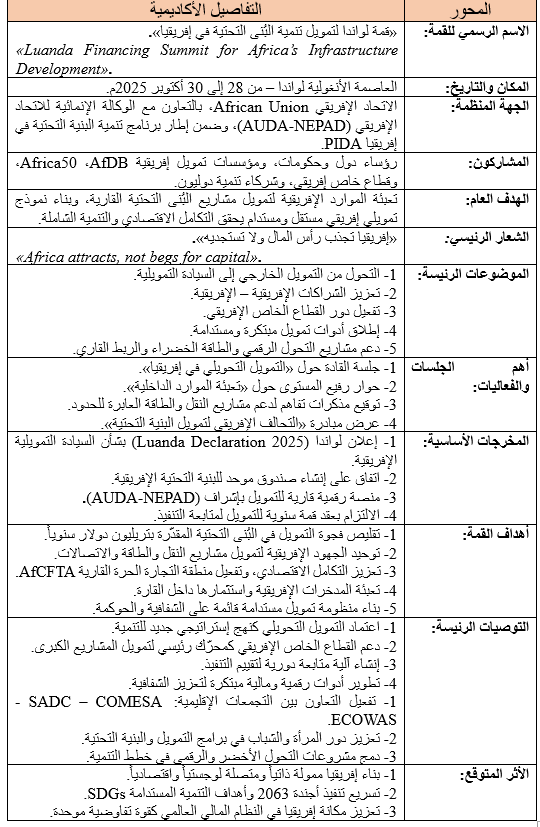 جدول ملخص أعمال قمة لواندا لتمويل تنمية البُنى التحتية في إفريقيا (2025):