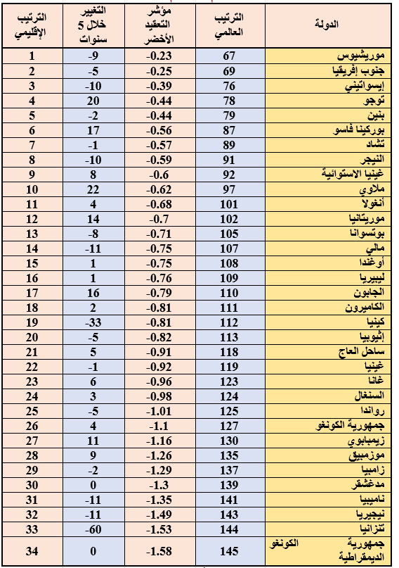 وقد كانت هناك 36 دولةً من بلدان إقليم جنوب الصحراء الإفريقية متضمنةً بالمؤشر، ومنه حاولنا من خلال هذا التحليل استبيان موقعها في مؤشر التعقيد الأخضر، من خلال النقاط الآتية:
