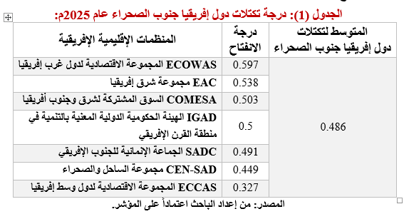 يوضح الجدول (1) أن تكتل إيكواس يتصدر قائمة التكتلات الأكثر انفتاحاً على التنقل الإقليمي، ويُعزى ذلك إلى التطبيق الكامل لمبدأ المعاملة بالمثل بين الدول الأعضاء واعتماد جواز السفر الموحد، ما يعكس مستوى متقدماً من التنسيق والسياسة المشتركة داخل المجموعة. على الجانب الآخر؛ يُظهر كلٌّ من تكتل  EACوIGAD تحسُّناً ملحوظاً في حرية التنقل، لكن هذا التحسن يبقى محدوداً بالاختلاف الكبير بين السياسات الوطنية للأعضاء؛ فبينما بعض الدول تتسم بالليونة؛ تبقى أخرى متشددةً في شروط التأشيرة، ما يحدّ من فعالية التكامل على مستوى المجموعة ككل.