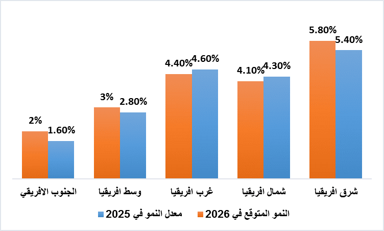بينما من المتوقع أن يتباطأ في شمال إفريقيا قليلاً إلى 4.1% في عام 2026م، بعد نمو قوي بلغ 4.3% في عام 2025م، مدعوماً بتحسّن أوضاع ميزان المدفوعات وانتعاش قطاع السياحة. أما غرب إفريقيا؛ فمن المتوقع أن ينمو بنسبة 4.4% في عام 2026م، بانخفاض طفيف عن 4.6% في عام 2025م، وسط إصلاحات اقتصادية كلية في نيجيريا وارتفاع أسعار المعادن النفيسة. وفي وسط إفريقيا؛ من المتوقع أن يبلغ النمو 3.0% في عام 2026م، وهو أقل من المتوسط القاري ولكنه أعلى من تقديرات عام 2025م البالغة 2.8%، مما يعكس استمرار الاعتماد على الصناعات الاستخراجية والاضطرابات الناجمة عن النزاعات. أما الجنوب الإفريقي؛ فمن المتوقع أن يرتفع نموها بشكل طفيف من 1.6% في عام 2025م إلى 2.0% في عام 2026م، ولكنه سيظل ضعيفاً بسبب القيود الهيكلية وزيادة التأثر بالتعريفات الأمريكية المرتفعة[8].