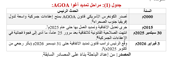 منذ إقرارها عام 2000م، مثّلت أغوا AGOA إطاراً محورياً للتعاون التجاري الأمريكي–الإفريقي، عبر إتاحة النفاذ المُعفى من الرسوم الجمركية لآلاف السلع الإفريقية إلى السوق الأمريكية، بما أسهم في دعم الصادرات، وخلق فرص عمل، وشجع بعض مسارات التصنيع الموجه للتصدير. غير أن التطبيق العملي كشف عن اختلالات بنيوية، أبرزها التركز الجغرافي والقطاعي للمكاسب، والاعتماد على عدد محدود من الدول والسلع، فضلاً عن هشاشة الامتيازات المرتبطة بالطابع المؤقت للاتفاقية وربطها بشروط الحوكمة.