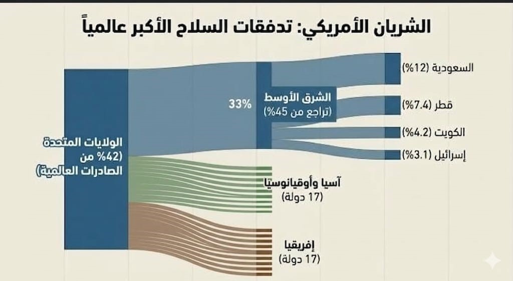 ويضيف التقرير: أن المملكة العربية السعودية كانت أكبر مستفيد من صادرات الأسلحة الأمريكية بنسبة 12٪، ما يجعلها أكبر مستفيد على المستوى الإقليمي والعالمي في الفترة (2021–2025م). كما كانت قطر (7.4٪) والكويت (4.2٪) من بين أكبر 10 مستفيدين من إجمالي صادرات الأسلحة الأمريكية، بينما كانت إسرائيل المستفيد الـ12 من صادرات الأسلحة الأمريكية في الفترة نفسها، بنسبة 3.1٪، كما يوضحه الإنفوجرافيك الآتي:
