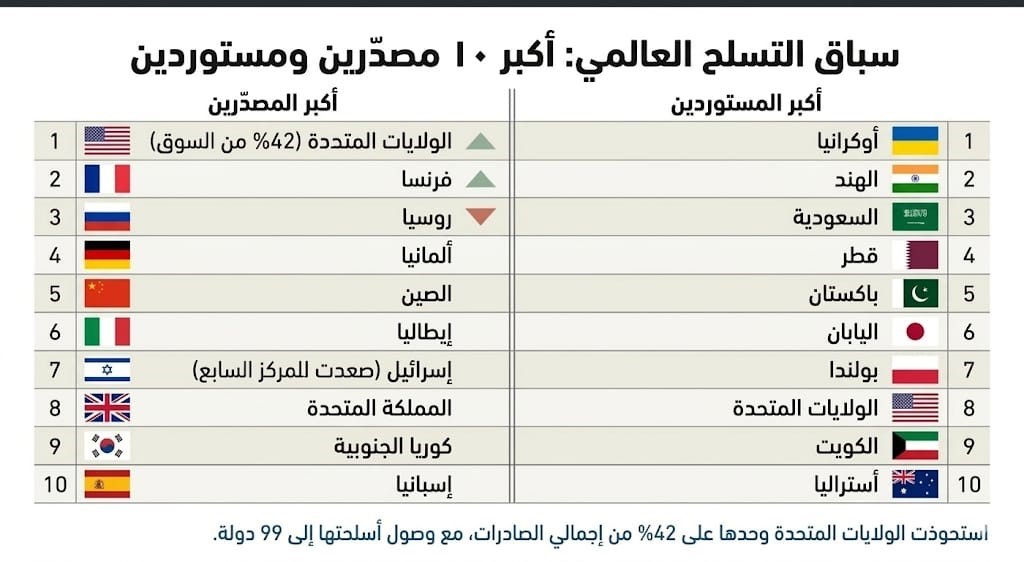 المصدر: بتصرف، بحسب تقرير معهد ستوكهولم لأبحاث السلام حول تجارة الأسلحة الدولية، النسخة الإنجليزية، مارس 2026م.