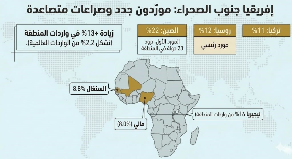 حول إفريقيا جنوب الصحراء على وجه التحديد؛ يشير التقرير إلى أن الدول في هذه المنطقة قد شهدت ارتفاعاً في وارداتها (2021-2025م) من الأسلحة بنسبة 13٪ مقارنةً بفترة (2016–2020م)، وشكّلت 2.2٪ من إجمالي الواردات العالمية من الأسلحة الكبيرة في الفترة نفسها (2021–2025م)، وكانت أكبر 3 دول مستفيدة هي: نيجيريا التي تلقت 16٪ من واردات إفريقيا جنوب الصحراء، والسنغال بنسبة 8.8٪، ومالي بنسبة 8.0٪.