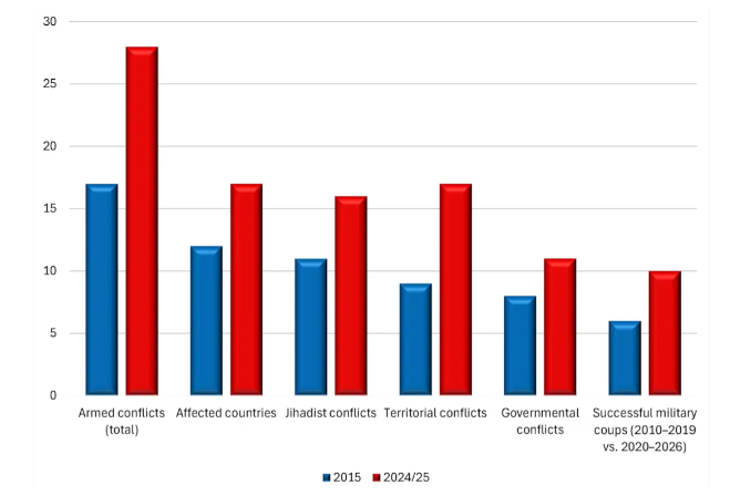 تدخل إفريقيا عام 2026م بمخاطر متعددة المستويات للصراعات العنيفة التي لا تزال عالية الخطورة بشكلٍ مثير للقلق وتتزايد باستمرار. ومقارنةً بالعقد الماضي؛ ارتفع عدد النزاعات المسلحة والدول المتأثرة بها بشكلٍ ملحوظ، كما تشهد المنطقة تزايداً في حركات التمرد الانفصالية/الإقليمية والحكومية (انظر: الشكل 2). وتستمر حركات التمرد في التوسع، ولا سيما في غرب إفريقيا، والقرن الإفريقي، ومنطقة البحيرات الكبرى في وسط إفريقيا، وشمال موزمبيق. ولا يزال من غير المؤكد ما إذا كانت الغارات الجوية الأمريكية على شمال غرب نيجيريا ستترك أثراً دائماً. يتداخل الهنف المسلح جزئياً مع الصراع الانفصالي، مما يُشكّل خطراً مستقلاً، فقد يتصاعد الحراك الانفصالي في جنوب غرب نيجيريا. ولا تزال أزمة الناطقين بالإنجليزية في الكاميرون دون حل، كما أن التسوية السياسية في إثيوبيا بشأن منطقة تيغراي لا تزال هشة. وتلوح في الأفق أيضاً توترات بين الدول، فالعلاقات بين إثيوبيا وإريتريا لا تزال متوترة، وسيستمر تورط رواندا في شرق جمهورية الكونغو الديمقراطية في تهديدٍ بتصعيد إقليمي أوسع نطاقاً، على الرغم من جهود الوساطة الجارية واتفاق السلام الذي توسطت فيه الولايات المتحدة وقطر.