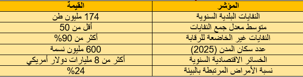 ويُشير البنك الدولي إلى أن تكاليف إدارة النفايات قد ترتفع بحدة بحلول عام 2030، في حال عدم تحسين النظم، ممّا يُضاعف العبء الاقتصادي لهذه الظاهرة.