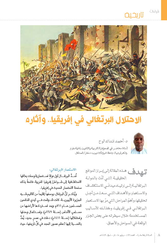 الملخص: يسلط هذا المقال الضوء على الدوافع الحقيقية التي دفعت الدولة البرتغالية للدخول في مجال الاستعمار، والأهداف التي سعت إلى تحقيقها، ومراحل الاستعمار البرتغالي في إفريقيا، بالإضافة إلى الأساليب التي استخدمتها للسيطرة على بعض الجزر الأفريقية وسواحلها. كما كانت البرتغال أول دولة صليبية تقاتل على سواحل أفريقيا جنوب الصحراء لأسباب دينية، وذلك بالتحالف مع فرسان القديس يوحنا الذين كانوا يعيشون في الحبشة. نجحت البرتغال نجاحًا كبيرًا في هذه المهمة لأنها نجحت في استعمار بعض الدول الأفريقية، والاستيلاء على المراكز التجارية ومنع تطور الإسلام وانتشاره في الدول الأفريقية عامة ومستعمراتها السابقة في القارة خاصة: الرأس الأخضر وغينيا بيساو وأنغولا وموزمبيق وساو تومي وبرينسيبي. كان للاستعمار البرتغالي تأثير كبير، سلبي في معظمه، على المستويات الثقافية والاجتماعية والسياسية والاقتصادية والدينية والحضارية وغيرها. ويتأكّد الأثر السلبي على الجانب الديني من خلال حقيقة أن عدد المسلمين في المستعمرات البرتغالية أقل بكثير منه في المستعمرات الأخرى.