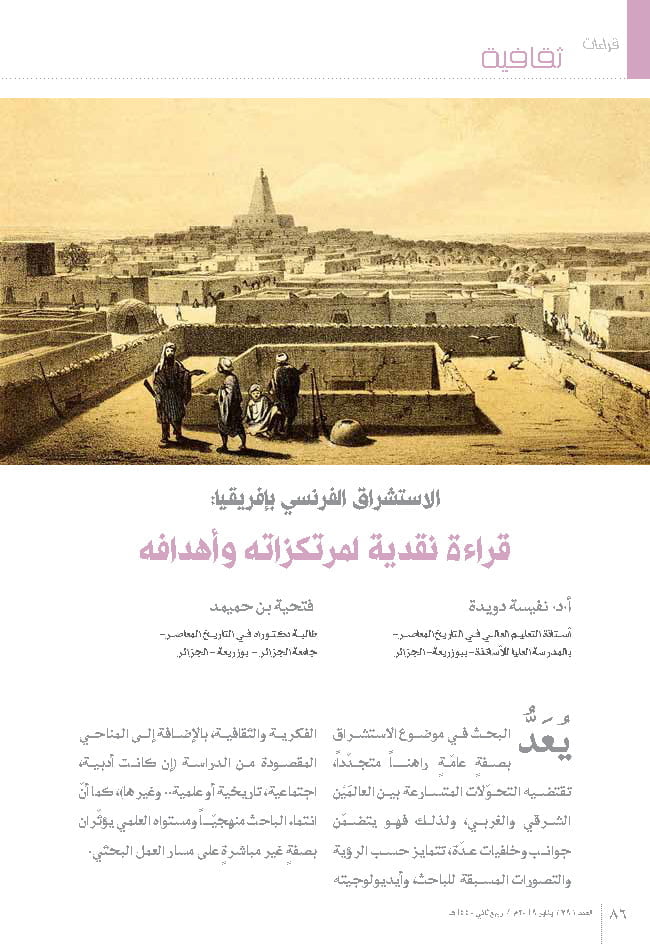 Abstract: In this paper we will try to study the French Orientalism, to explain the conditions of its appearance, its objectives, and to focus particularly on its interests in the African continent. Studies on Orientalism in general are many and varied; however, in its part on Africa (especially the sub-Saharan region), they are very limited, and are almost confined to shy attempts if compared to the previous ones.