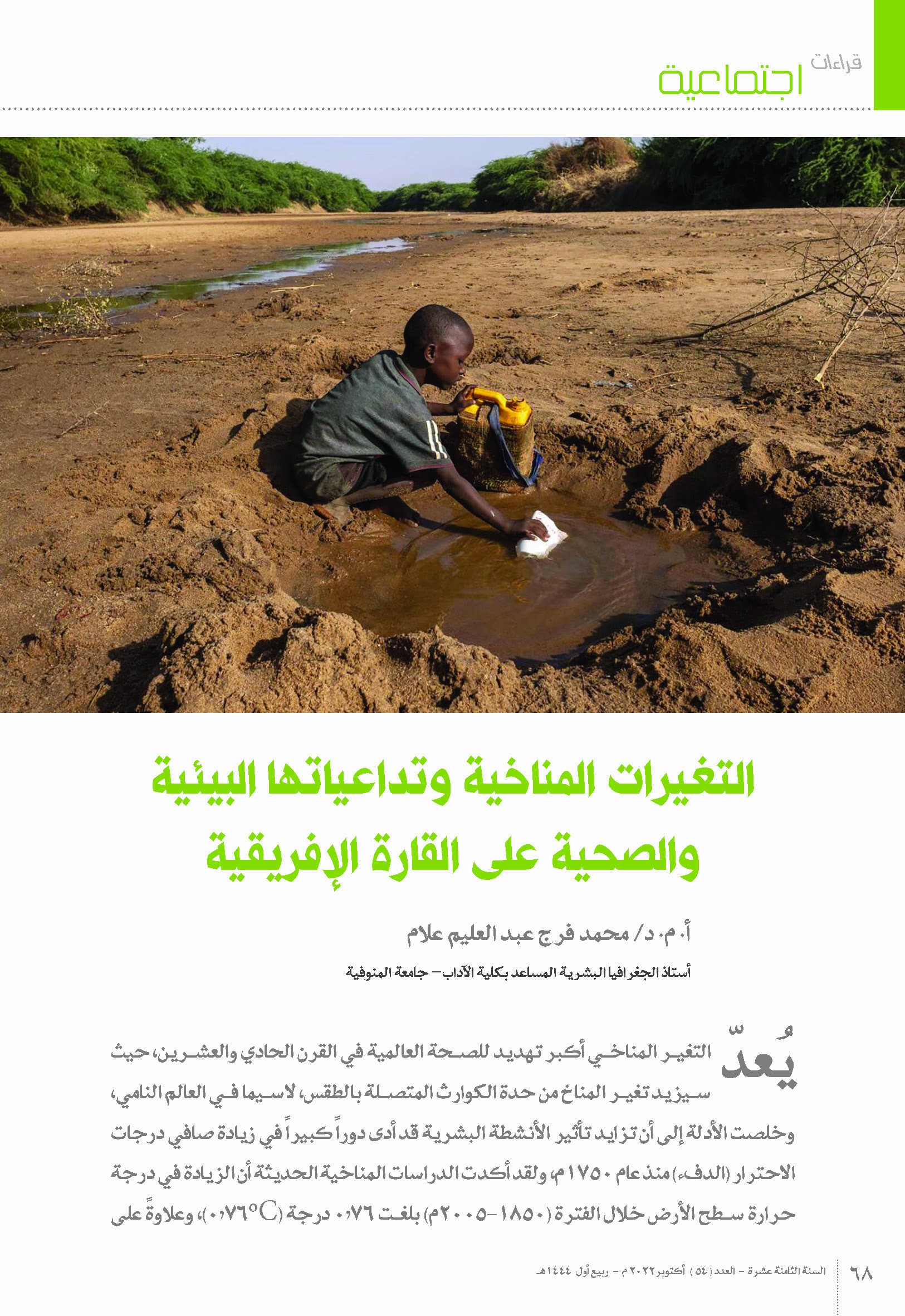 Abstract: Climate change is the biggest threat to global health in the twenty-first century, as climate change will increase the severity of weather-related disasters, especially in the developing world, and the evidence concludes that the increasing impact of human activities has played a major role in increasing net warming (warmth) since 1750 AD. Recent climatic studies have confirmed that the increase in surface temperature during the period (1850-2005 AD) amounted to 0.76 degrees. Moreover, the linear trend of warming in the last 50 years was recorded by 0.13 degrees per decade. It has the lowest greenhouse gas emissions; However, it will witness the most severe consequences of climate change. The study came in four main axes. The first axis dealt with climatic changes in the continent: features and evidence. During the second half of the last century, the average annual temperature in Africa increased by about half a degree Celsius in some geographical areas of the continent. In the countries of the Nile Basin, it increased by (from 0.2 to 0.3 degrees Celsius in 10 years), and in other countries such as Rwanda it increased by (from 0.7 to 0.9 degrees Celsius in 50 years), and recent climatic fluctuations in Africa indicated a noticeable decrease in the amount of precipitation; This leads to a noticeable decrease in the average discharge of some surface water sources by between 40% and 60% since the early seventies of the last century. This has resulted in a significant decrease in the surface area of most of the natural wetlands in the region, as manifested in Lake Chad. As for the second axis, it dealt with the environmental repercussions of climate change, as the possible repercussions of climate change on the ecosystem of the brown continent were numerous, both on ecosystems and biodiversity, and the water security of the continent, and the areas and areas affected by desertification, agricultural production and food security, and the third axis completed the negative repercussions of Al-Mansour Al-Health Where he discussed population displacement in some African cities at risk, as in Alexandria (Egypt), Lagos (Nigeria), Banjul (Gambia), Mombasa (Kenya), Abidjan (Ivory Coast), and Bamenda (Cameroon). This is in addition to dealing with the return of diseases and the emergence of other diseases, as climate change or environmental change has caused an imbalance between diseases and humans; Therefore, vector-borne diseases have become the most prominent problems in tropical countries, and the study concluded in its fourth axis by addressing protection and adaptation measures, in terms of maintaining health infrastructure, developing early warning systems and programs to combat infectious diseases.