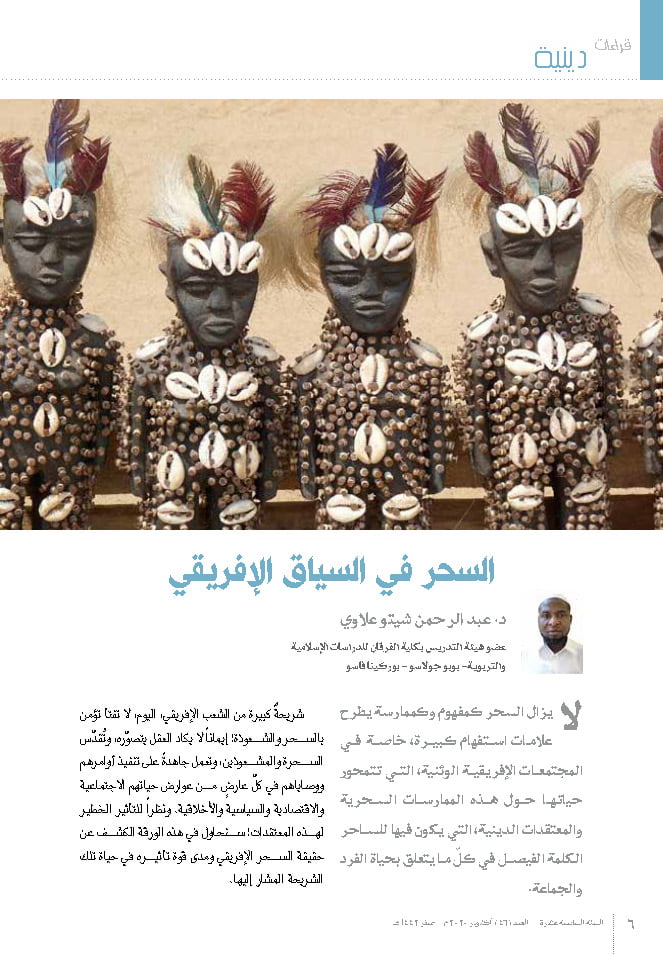 الملخص: لا يزال السحر كمفهوم وكممارسة يطرح علامات استفهام كبيرة، خاصة في المجتمعات الإفريقية الوثنية، التي تتمحور حياتها حول هذه الممارسات السحرية والمعتقدات الدينية، التي يكون فيها للساحر الكلمة الفيصل في كلّ ما يتعلق بحياة الفرد والجماعة. شريحةٌ كبيرة من الشعب الإفريقي، اليوم، لا تفتأ تؤمن بالسحر والشعوذة؛ إيماناً لا يكاد العقل يتصوره، وتُقدّس السحرة والمشعوذين، وتعمل جاهدةً على تنفيذ أوامرهم ووصاياهم في كلّ عارض من عوارض حياتهم الاجتماعية والاقتصادية والسياسية والأخلاقية. ونظراً للتأثير الخطير لهذه المعتقدات سنحاول في هذه الورقة الكشف عن حقيقة السحر الإفريقي ومدى قوة تأثيره على حياة تلك الشريحة المشار إليها، وذلك من خلال عدة مباحث، تبدأ بتعريف بالسحر، ثم السحر في اللغات الإفريقية.. قراءة في الدلالة، والسحر والساحر في المعتقدات الإفريقية، وإلقاء الضوء على البعد التاريخي لممارسة السحر، والخصائص العامة للسحر في إفريقيا، وأنواع السحر في إفريقيا، وطرق نقل السحر من شخص إلى آخر، والسحر الإفريقي في ظل تطور العصر، ومبادرات لمعالجة ظاهرة السحر والحد منها.