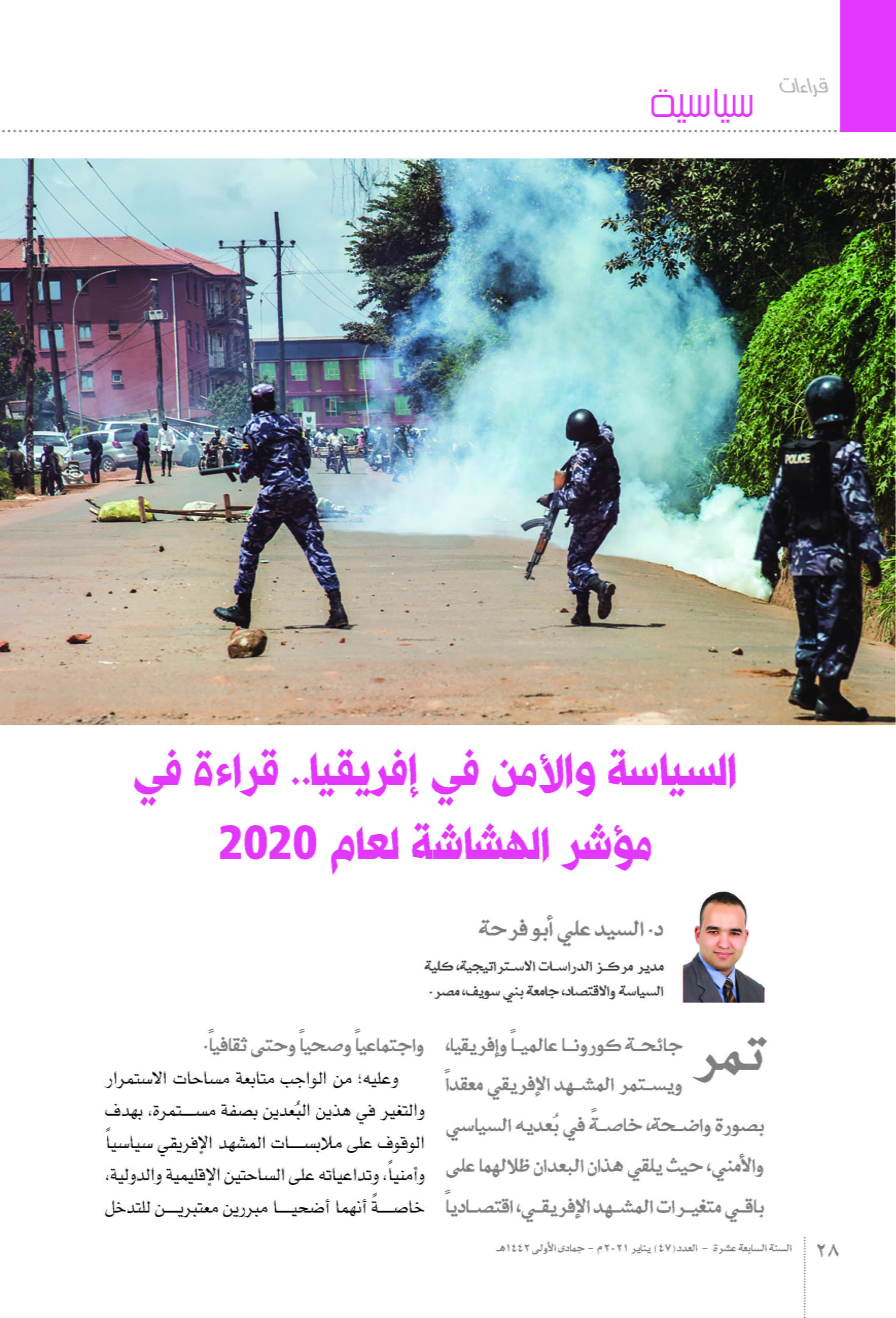 Abstract: The Corona pandemic passes through the world and Africa costly, the African scene continues to be considerably complex, especially in its political and security dimensions, as these two dimensions cast shadows on the rest of the variables of the African scene, economically, socially, healthily and even culturally, it is imperative to follow up the areas of continuity and change in these two dimensions on a continuous basis in order to determine the circumstances The African political and security scene, its repercussions on the regional and international arenas, especially since these have become considered justifications for the current international intervention in Africa, where many foreign military activities of regional and international powers in Africa have lately hidden behind the fight against terrorism, security and political liquidity, and the related growth of organized crime activities. . Therefore, the researcher aims to find out the developments of politics and security in Africa in light of the analytical reading of one of the most important international indicators concerned in this regard, which is the Fragile State Index for 2020, through a major question: What are the developments in politics and security in the African continent according to the report of the fragile states For 2020? The main question stems from the following sub-questions: What is the position of Africa in this aforementioned indicator? What are the areas of continuation and change in that situation? What will happen to this situation if it continues on the African reality? The researcher relies on David Aston's approach known as systems analysis as a method for researching the inputs affecting the political and security situation in Africa, the outputs of that situation on the African future, and the areas of interaction that take place as a result of that situation.