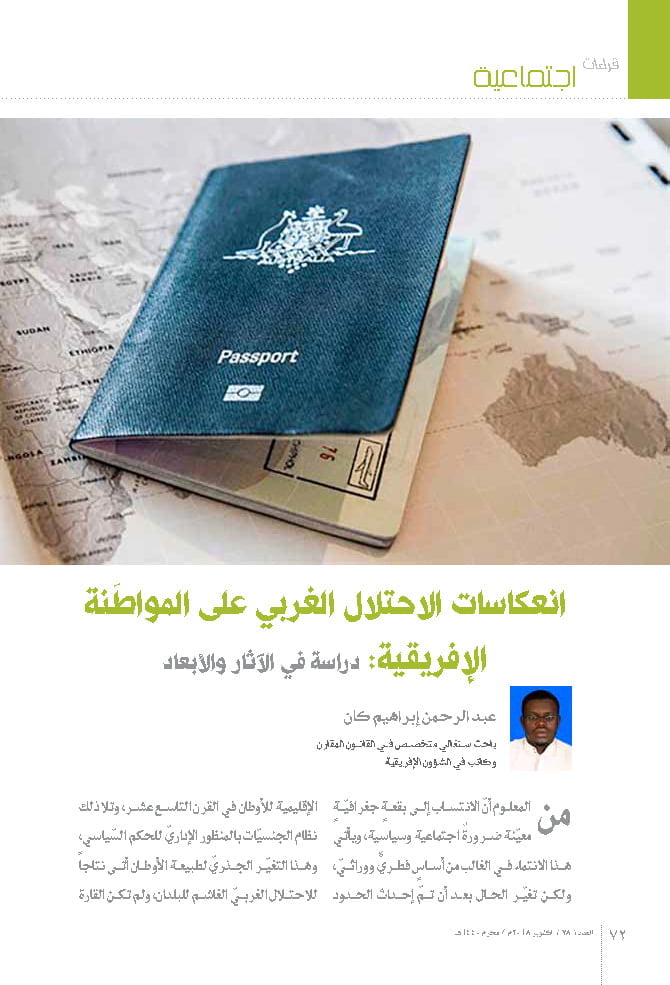 الملخص: من المعلوم أنّ الانتساب إلى بقعةٍ جغرافيّةٍ معيّنة ضرورةٌ اجتماعية وسياسية، ويأتي هذا الانتماء في الغالب من أساسٍ فطريٍّ ووراثـيّ، ولكن تغير الحال بعد أن تمّ إحداث الحدود الإقليمية للأوطان في القرن التاسع عشر، وتلا ذلك نظام الجنسيّات، وهذا التغيّر الجذريّ لطبيعة الأوطان أتى نتاجاً للاحتلال الغربيّ الغاشم للبلدان، ولم تكن القارة الإفريقية خارجةً عن ذلك، إذ يتمثّل رأس المعاناة لدى الأفارقة في التشكّل المزدوج للإنسان الإفريقي إزاء المواطَنة؛ من حيث الصدق في الانتماء والتكيُّف في الانتساب، ولذلك، كان لا بدّ من مراجعة قراءة «المواطَنة الإفريقية»، والتي يُعنى بها ارتباط الأفارقة بأوطانهم ولاءً وخدمةً. لقد تأثّر جلّ الأفارقة بثقافة المُستعمِر، وبخاصّةٍ الذين يقيمون في الغرب الإفريقي الفرنسيّ، في المجالات الاجتماعية والسياسية والاقتصادية، وبقيت انعكاسات الاحتلال الغربيّ عائقةً للمواطَنة الإفريقية، حيث قلّلت آثارُ الاحتلال مشاعرَ الحبّ والارتباط بالوطن عند الأفارقة، وانبثق عنها ضعف الاستجابة في تقديم الجهود ورسم الخطط ووضع الموازنات العلميّة والعمليّة لتطوير القارة؛ وأدّى كلّ ذلك إلى عدم ارتياح الإنسان الإفريقي غالباً للبقاء في وطنه، كما نتج عنه تزايد الهجرة غير الشرعية، وضعف المشاركة السياسية، وقلّة الأداء الاجتماعي، وموت روح الانتماء، ومشكلة الازدواجية في الهُوِيّة. لم يكن البعدان الثقافيّ والاجتماعيّ كافيَيْن لدى سلطات الاحتلال في تشكيل تلك المواطَنة المزدوجة عند الإفريقي، بل تجاوز الأمر إلى ترجمة هذَيْن البعدَيْن في الحركة السياسية والإدارية، وكانت بدايتها نابعةً من الانبهار بالثقافة الغربية، وصياغة النهج التربويّ والتعليميّ على نمط فكر المُستعمِر. أضف إلى ذلك الأنظمة السّياسية التي خلّفها الاحتلال، والتي لا تزال متّبعَةً في إفريقيا، ما يجعل المواطن الإفريقي يتساءل عن حقيقة الاستقلال ومدى واقعيّته. ولمبدأ المواطنة دَوْرٌ في تعزيز الوحدة الوطنيّة، والقدرة على نشر التّعايش السلمي بين الشعوب، وتقليل الخلافات فيما بينها، ولا يتحقق ذلك كلّه إلا بأن تهتم الشعوب بالعلم والمعرفة، وضرورة حماية هُوِيّتهم، التي من خلالها يمكن المحافظة على قيمهم الإنسانية الأصيلة.