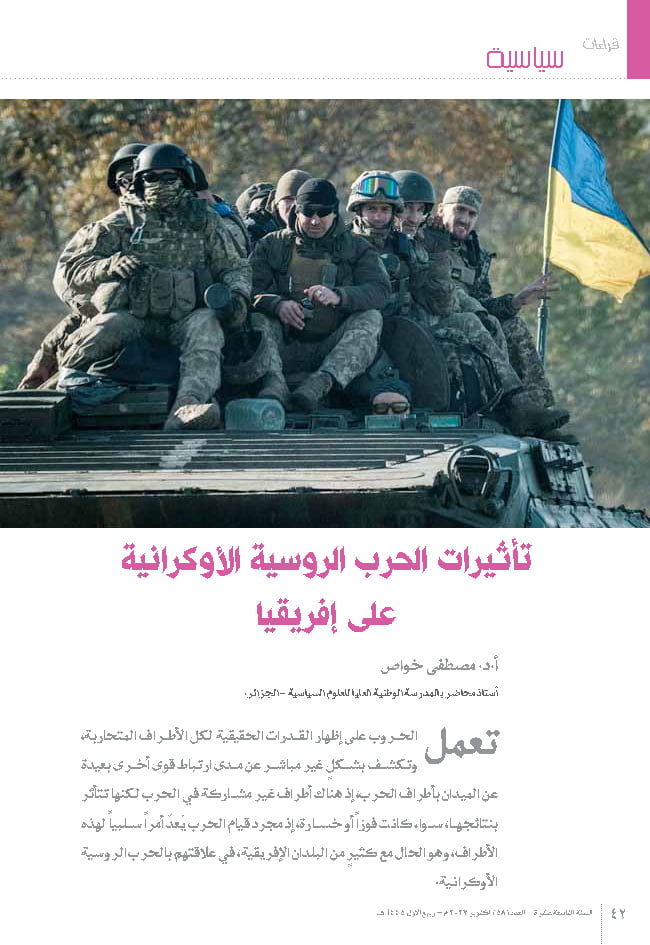Abstract: The study reveals the economic, political and military repercussions of the Russian invasion of Ukraine on African countries, after the rise in prices of energy, agricultural materials and fertilizers, the fear of increasing political and security instability, and the continent’s transformation into an arena of struggle for influence between Russia and the West. The paper also points to some strategies for avoiding or mitigating the negative repercussions of this war, while noting some of the positive effects that the war had on some African countries in general. The level of economic exchange between the two parties to the conflict and African countries is not large, but its importance lies in the quality of the goods exchanged, which are often represented by food and weapons, in addition to the political and security presence of Russia on the continent, which it is working to develop, which clashes with Western influence, which makes the political repercussions The security implications of the Russian-Ukrainian war are more dangerous to the African continent than the economic repercussions. The paper discusses this through a number of axes: food and energy prices and the expansion of poverty in Africa, Russian trade and investment in Africa, increasing political and security instability, strategies to mitigate the effects of war, and Africa’s opportunities that came with the war.