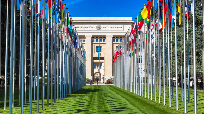 The flag alley at the United Nations European headquarters is seen during the Human Rights Council in Geneva, Switzerland, September 11, 2023. REUTERS/Denis Balibouse/File Photo