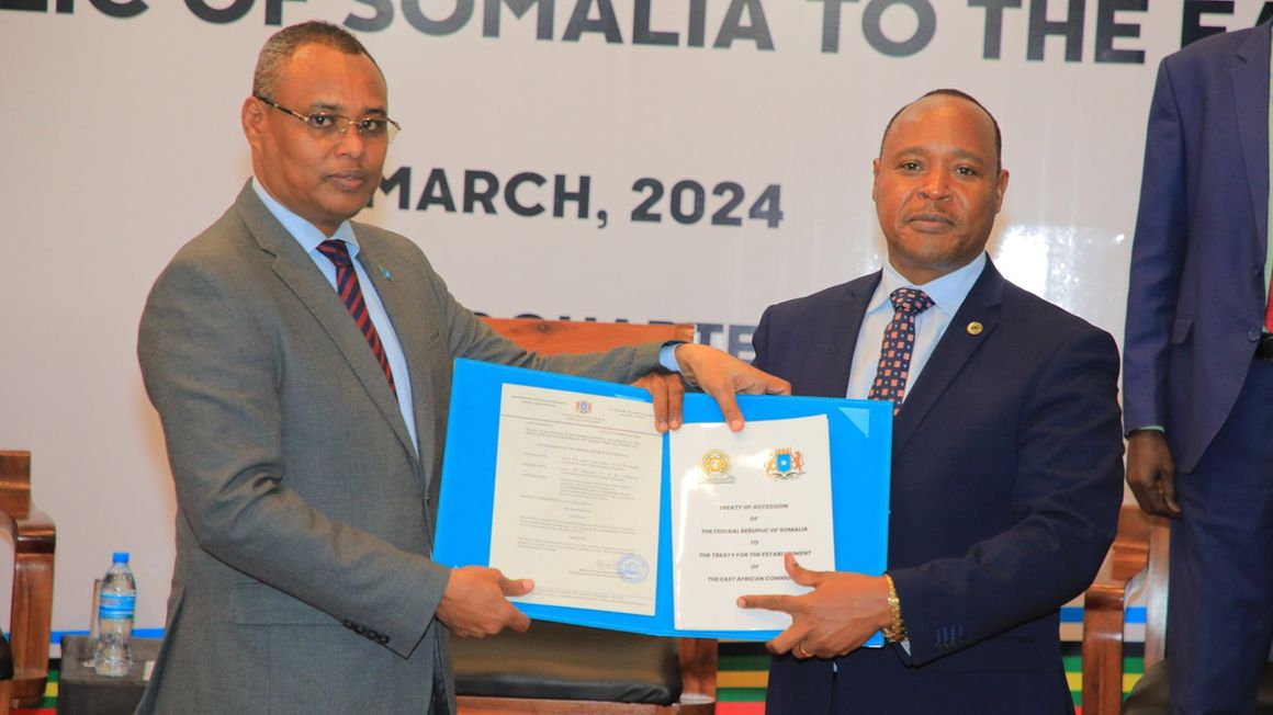 At a brief ceremony held Monday (Mar. 04) at the EAC headquarters in Arusha, Tanzania, Somalia’s Minister of Commerce and Industry,Jibril Abdirashid Haji, presented the instrument of ratification to the bloc’s Secretary-General, completing the admission process.