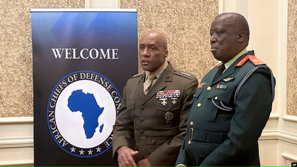 US Marine Gen. Michael Langley, head of US Africa Command, left, speaks to reporters at a conference of military chiefs from across Africa, with Lt. Gen. Placid Segokgo, Botswana’s commander of the defense force, June 25, 2024 in Gaborone, Botswana.