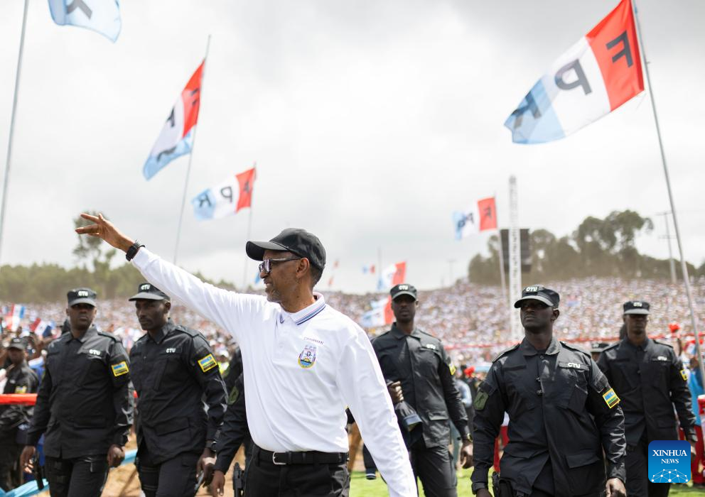 Rwandan President Paul Kagame waves during the launch of presidential campaign in Musanze, Rwanda, June 22, 2024. (Rwandan Office of the President/Handout via Xinhua)