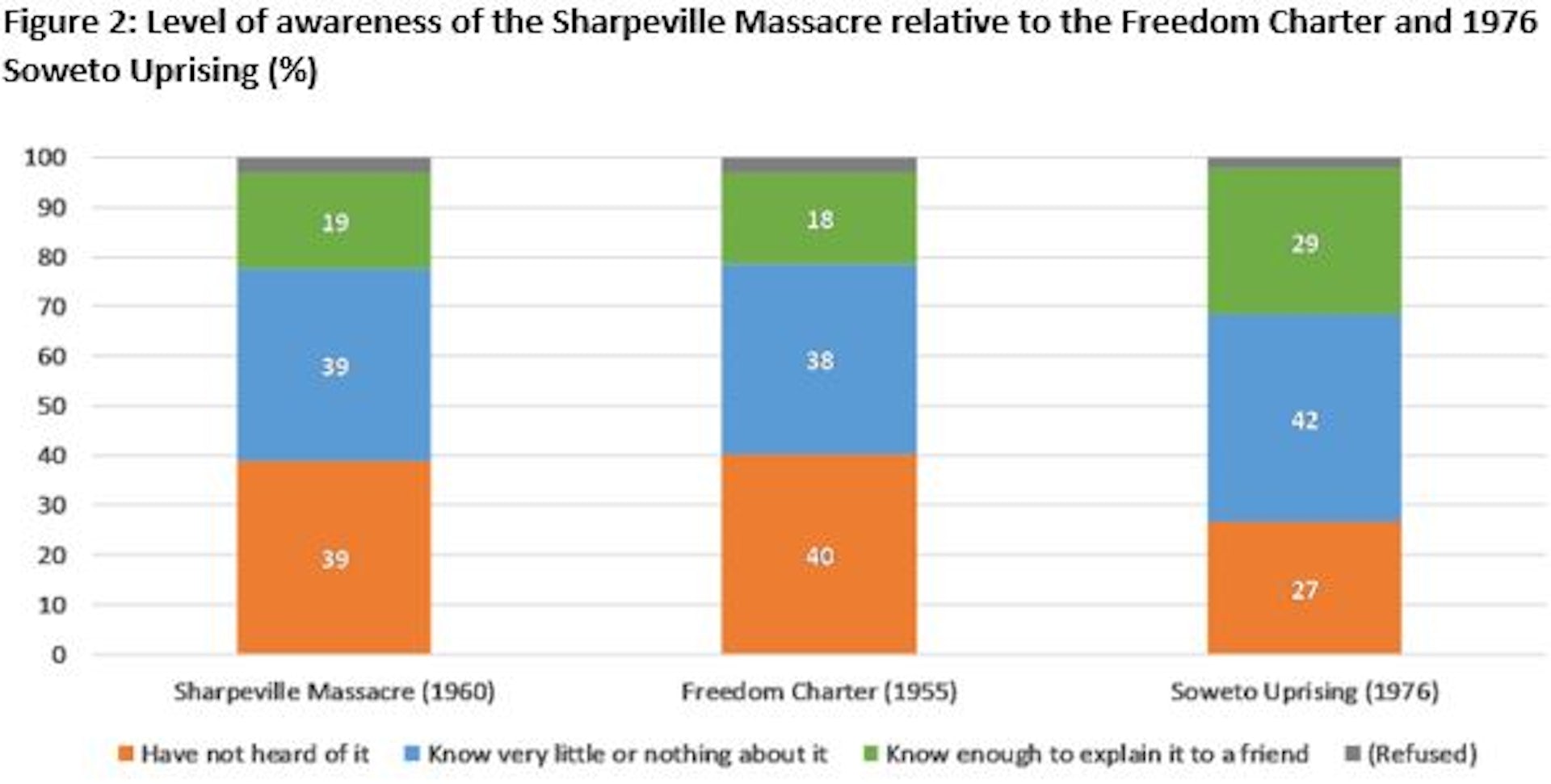 Many will be shocked by the limited public knowledge of a key event in modern South African history. To gain some perspective, we compared findings on knowledge of the Sharpeville massacre to knowledge of both the 1955 Freedom Charter and the 1976 Soweto Uprising.