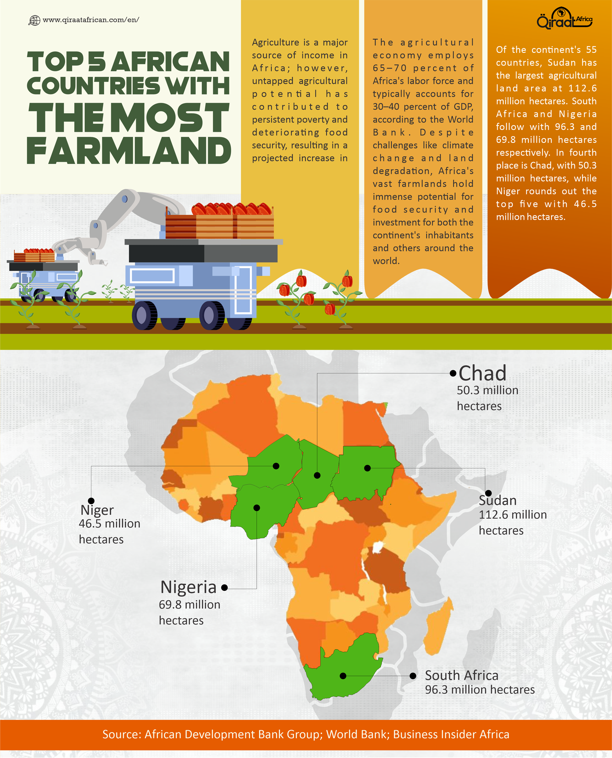 Of the continent’s 55 countries, Sudan has the largest agricultural land area at 112.6 million hectares. South Africa and Nigeria follow with 96.3 and 69.8 million hectares, respectively. In fourth place is Chad, with 50.3 million hectares, while Niger rounds out the top five with 46.5 million hectares.