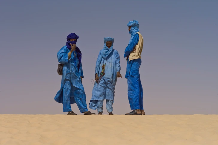Tuareg culture is embodied in their oral traditions, music that tells stories of the desert and unity, elaborate craftsmanship, and elegant clothing. Tuareg are known for wearing the tagelmust (indigo blue scarf), which covers the face except for the eyes. This scarf is believed to provide protection from the desert sand and sun and also carries social and spiritual significance. Unlike many other cultures, only men wear the veil. The indigo colour gives them the nickname “Blue People”.