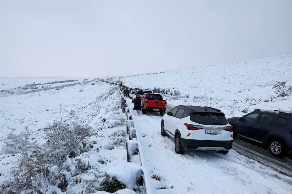 FILE PHOTO: Motorists queue after a snowfall during a cold front near Ceres, South Africa, July 8, 2024. REUTERS/Esa Alexander/File Photo