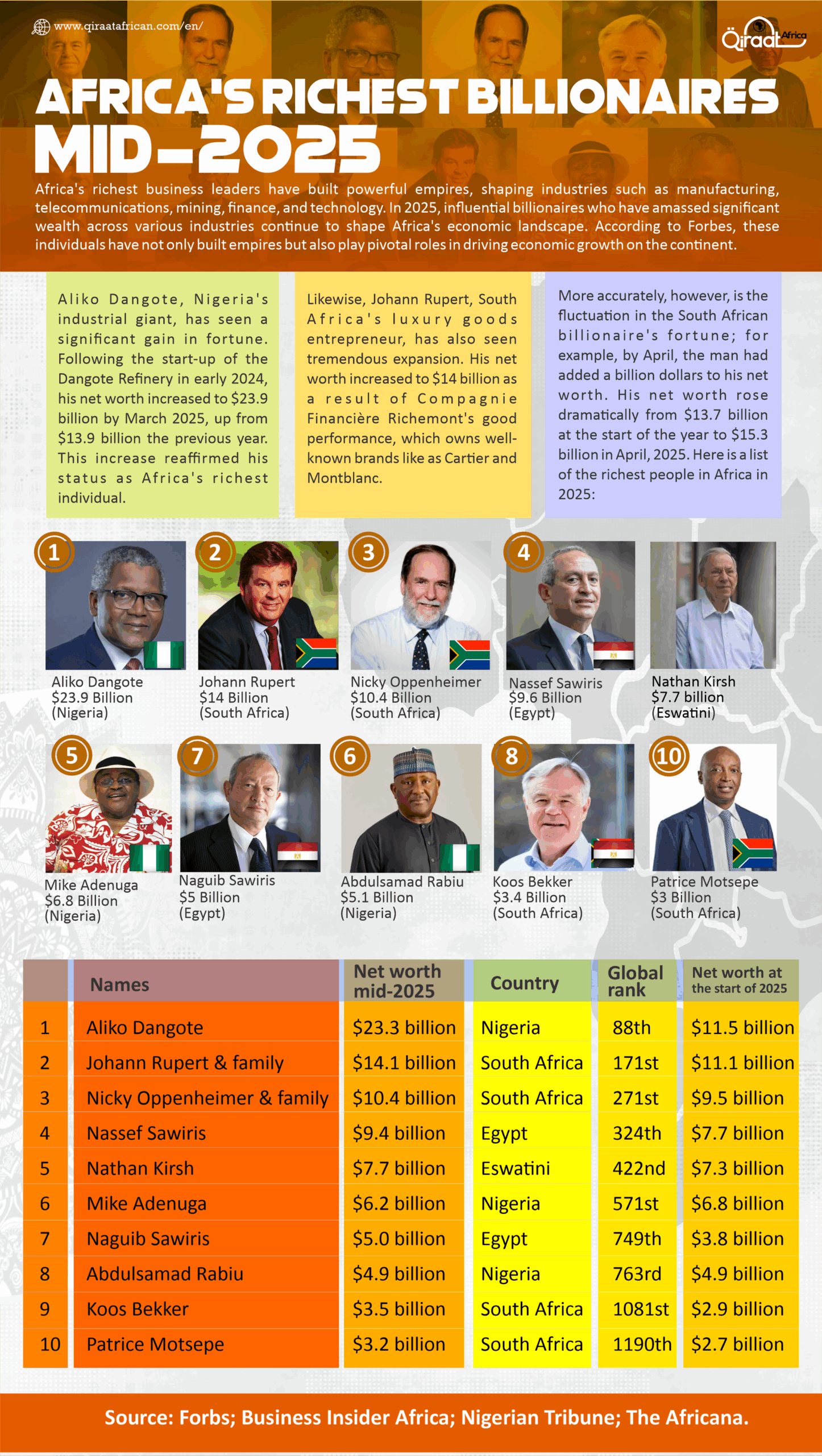 Africa’s richest business leaders have built powerful empires, shaping industries such as manufacturing, telecommunications, mining, finance, and technology. In 2025, influential billionaires who have amassed significant wealth across various industries continue to shape Africa’s economic landscape. According to Forbes, these individuals have not only built empires but also play pivotal roles in driving economic growth on the continent.