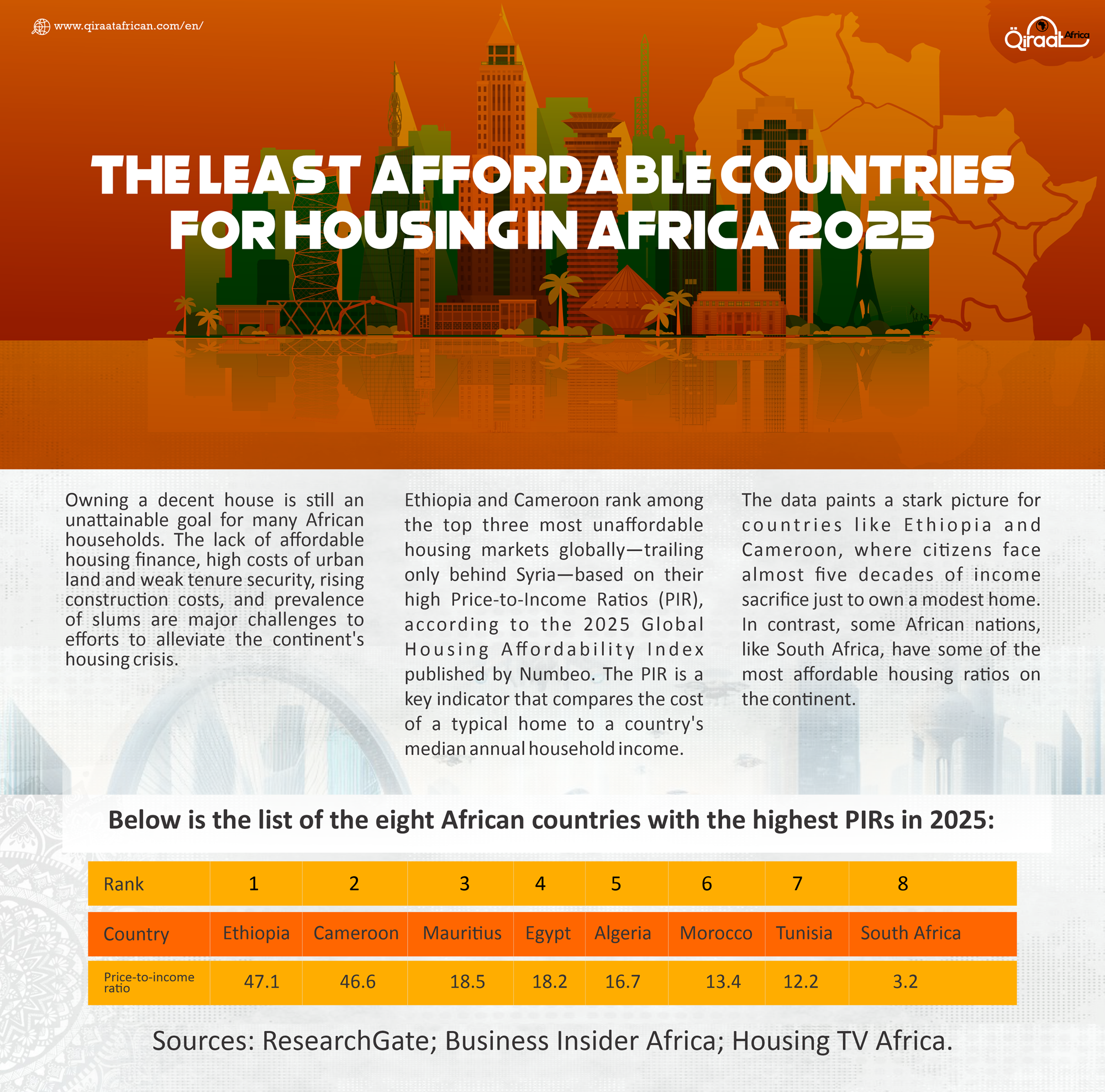 Ethiopia and Cameroon rank among the top three most unaffordable housing markets globally—trailing only behind Syria—based on their high Price-to-Income Ratios (PIR), according to the 2025 Global Housing Affordability Index published by Numbeo. The PIR is a key indicator that compares the cost of a typical home to a country’s median annual household income.