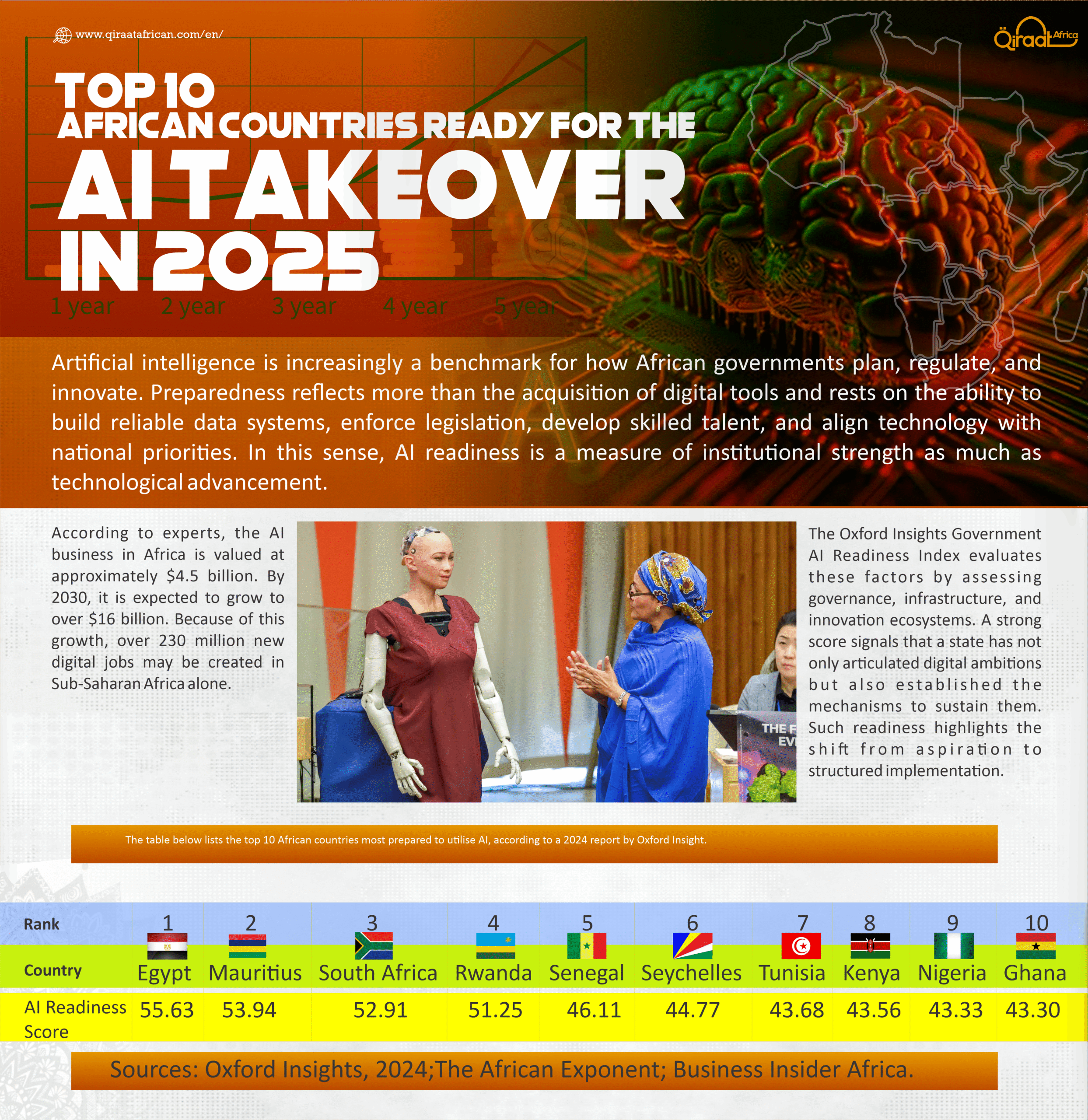 The table below lists the top 10 African countries most prepared to utilise AI, according to a 2024 report by Oxford Insight.