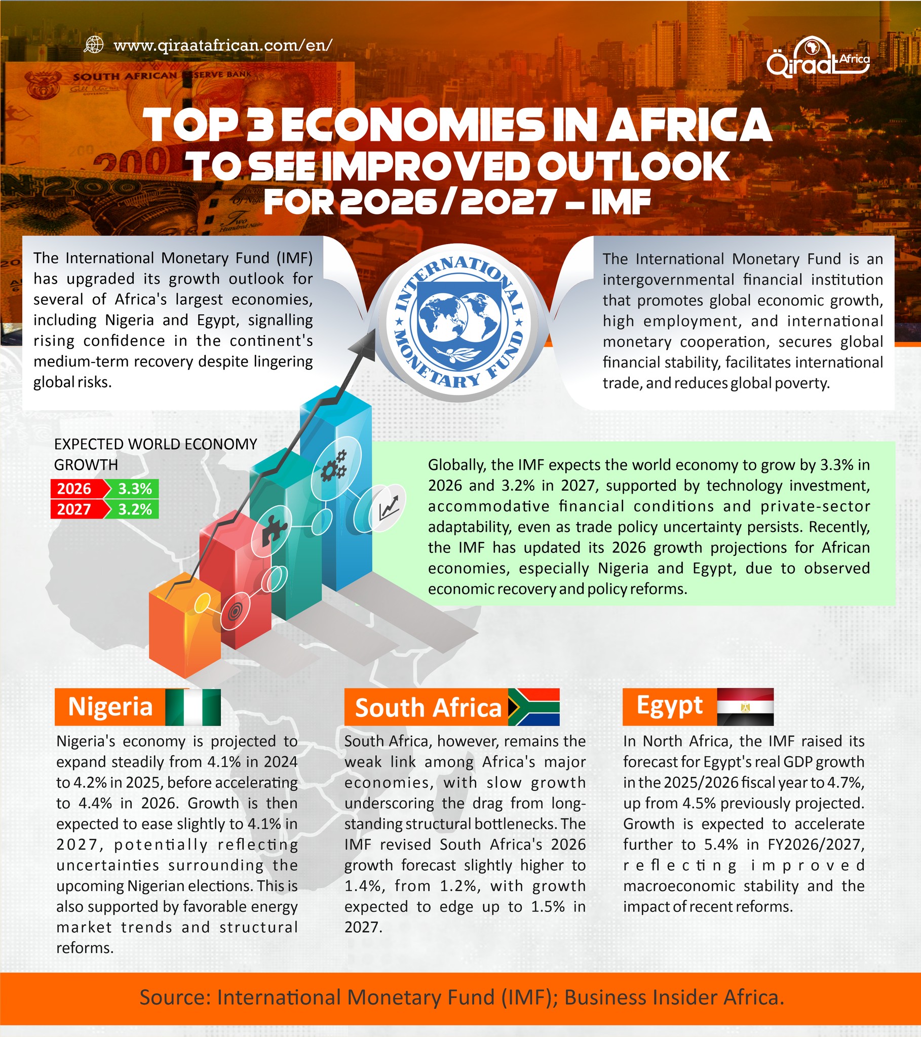 Globally, the IMF expects the world economy to grow by 3.3% in 2026 and 3.2% in 2027, supported by technology investment, accommodative financial conditions and private-sector adaptability, even as trade policy uncertainty persists. The IMF has updated its 2026 growth projections for African economies, especially Nigeria and Egypt, due to observed economic recovery and policy reforms.