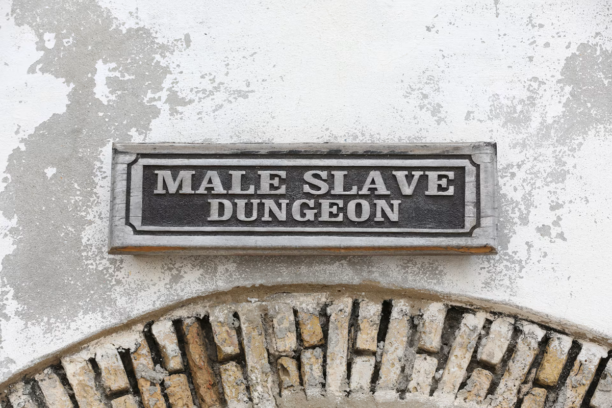 A sign that reads "Male Slave Dungeon" hangs at the entrance of a dungeon that was used to house slaves at Elmina Castle in Ghana, July 29 2019. REUTERS/Siphiwe Sibeko/File Photo
