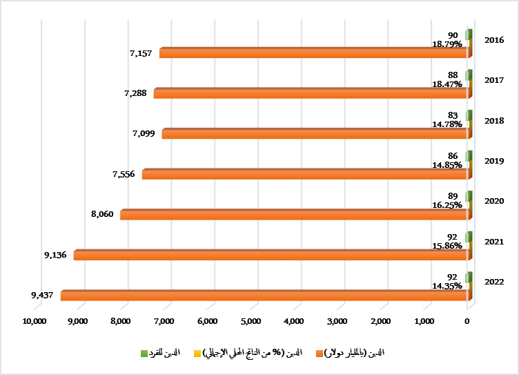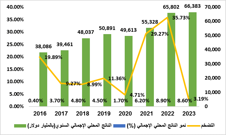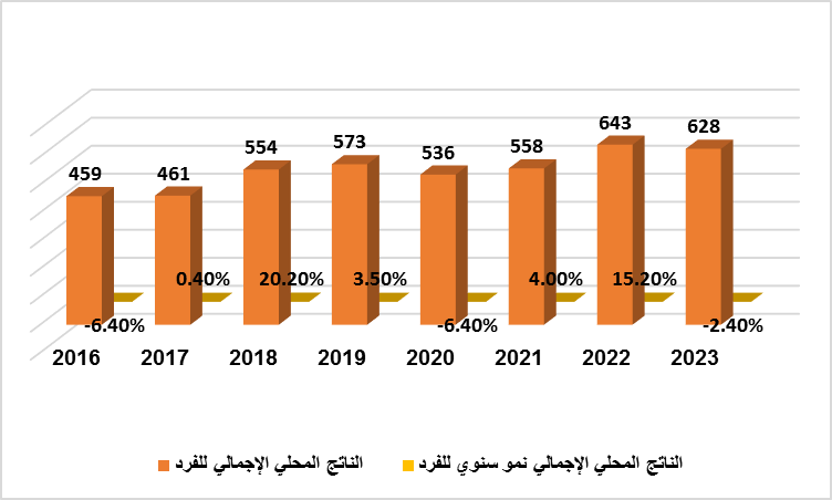 بلغ نصيب الفرد من الناتج المحلي الإجمالي مقارنة بنحو 459 دولار في عام 2023 نحو 628 دولارًا، أي أقل بنحو 15 دولارًا عن عام 2022، حين بلغ 643 دولارًا. مقارنة بنحو 459 دولار عام 2016.