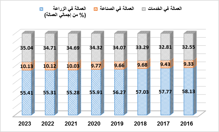 بلغت اجمالي القوى العاملة، لعام 2023، 37.51 مليون شخص، بزيادة عن 36.29 مليون شخص في عام 2022، بينما بلغت المشاركة في القوى العاملة، لعام 2023، 65.78 %، وهي زيادة عن 65.77 % في عام 2022، وكانت مشاركة القوى العاملة النسائية، لعام 2023 بنحو 62.67 % وهي زيادة عن 62.65 % في عام 2022. ([23]) ويوضح الشكل التالي توزيع العمالة على القطاعات المختلفة.