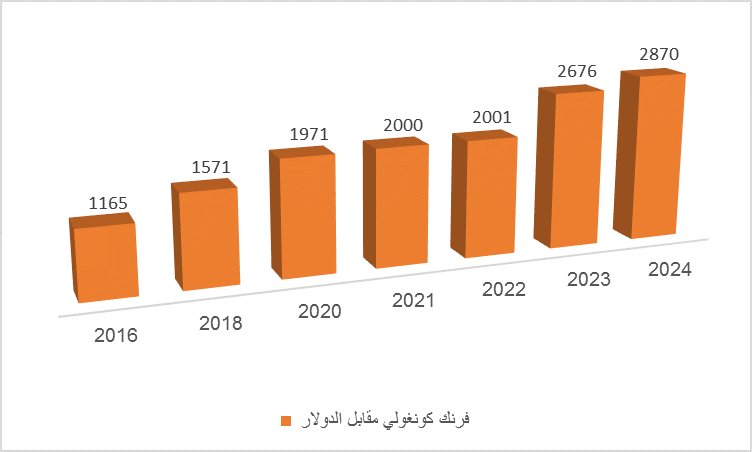 انتهى سعر الصرف في عام 2024 عند 2870 فرنك كونغولي مقابل الدولار الأمريكي، مقارنة بسعر 2000 فرنك كونغولي مقابل الدولار الأمريكي في عام 2020، والرقم قبل عقد من الزمان كان 532 فرنك كونغولي مقابل الدولار الأمريكي. ([33])