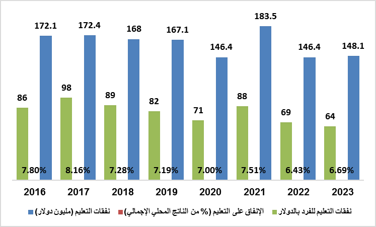 خُصص للتعليم الابتدائي 56% من ميزانية القطاع، وللتعليم الثانوي 32%، ولمرحلة ما قبل الابتدائي 0.4%. وارتفعت حصة التعليم والتدريب التقني والمهني من ميزانية القطاع بشكل طفيف من 1.7% في العام الدراسي 2018/2019 إلى 1.8% في العام الدراسي 2019/2020، بينما ارتفعت حصة رعاية وتنمية الطفولة المبكرة من ميزانية القطاع من 0.3% إلى 0.4%. أما التعليم العالي، فقد بلغت حصته 4.5% في العام الدراسي 2019/2020، بانخفاض عن 4.6% في العام السابق. ([2])