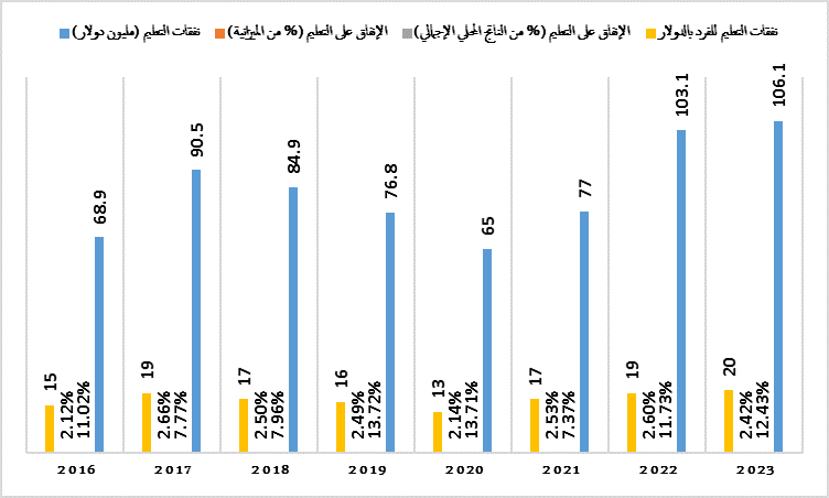 ومن خلال الشكل ارتفعت نفقات التعليم خلال الفترة من 2016 الى 2023، من 68.9 مليون دولار، الى 106.1 مليون دولار على التوالي، كما ارتفع الانفاق على التعليم % من الميزانية من 11.02%، الي 12.43%، خلال نفس الفترة، ويعد هذا ارتفاعا طفيفا مقارنة بدول افريقيا جنوب الصحراء، بينما بلغ الانفاق % من الناتج المحلي الإجمالي عند 2.4% عام 2023، بانخفاض عن 2.6% المنشورة في عام 2022.