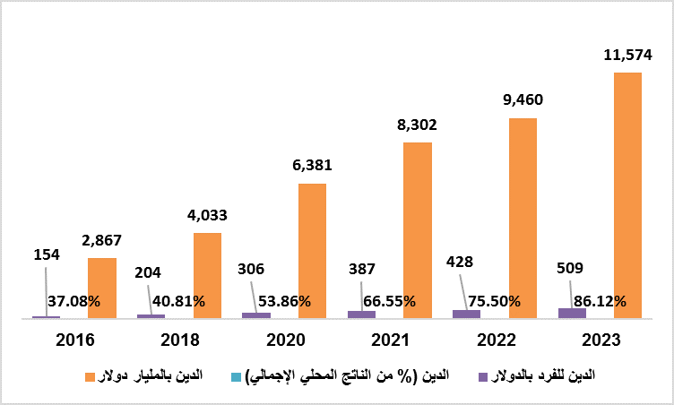إذا نظرنا إلى الشكل، يُمكننا رؤية تطور ديون ملاوي. فقد ارتفعت منذ عام 2016 من حيث الدين العالمي، حين بلغ 2.867 مليار دولار، وكذلك من حيث نسبتها إلى الناتج المحلي الإجمالي، حين بلغت 37.08%. وفقًا لآخر بيانات منشورة، بلغ نصيب الفرد من الدين في ملاوي 509 دولارات للفرد في عام 2023. وفي عام 2022، بلغ 428 دولارًا، ثم ارتفع بمقدار 81 دولارًا. وإذا عدنا إلى عام 2016، نجد أن نصيب الفرد من الدين بلغ 154 دولارًا.