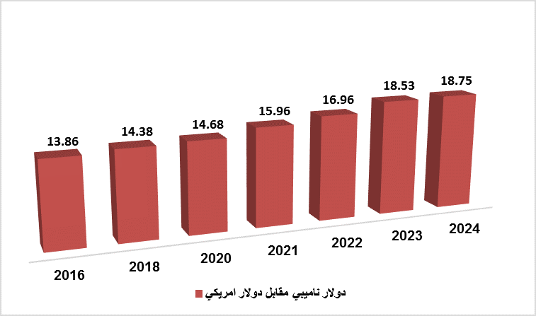 بلغ سعر الصرف في نهاية عام ٢٠٢٤ ١٨.٧٥ دولار ناميبي، مقارنةً بقيمة نهاية عام ٢٠٢٣ البالغة ١٨.٥٣ دولار ناميبي، و١١.٥٧ دولار ناميبي قبل عقد من الزمن. وبلغ متوسط سعر الصرف ١٥.١٤ دولار ناميبي خلال العقد الماضي. ([41]) ويوضح الشكل التالي أسعار الصرف والتغير فيه في ناميبيا.