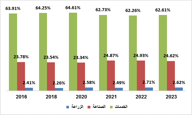 كان التقدم المحرز في التحول الهيكلي متباينًا، مع تزايد حصة قطاع الخدمات في الناتج المحلي الإجمالي، وتراجع حصة الصناعة. ساهم قطاع الخدمات بنسبة 62.6% من الناتج المحلي الإجمالي في عام 2022، ارتفاعًا من 51.3% في عام 1990، مدفوعًا بالخدمات المالية والعقارات والنقل. ومع ذلك، أظهر هذا التوسع قدرة محدودة على استيعاب العمال ذوي المهارات المحدودة. انخفضت حصة الصناعة من الناتج المحلي الإجمالي من 36% في عام 1990 إلى حوالي 25% في عام 2023. وانخفضت حصة التصنيع إلى النصف من 24% في عام 1990 إلى 12% من الناتج المحلي الإجمالي في عام 2023، بينما ظلت مساهمة الزراعة ثابتة عند 13%. وقد أدى هذا النمط إلى ركود النمو وتباطؤ خلق فرص العمل. ([4])