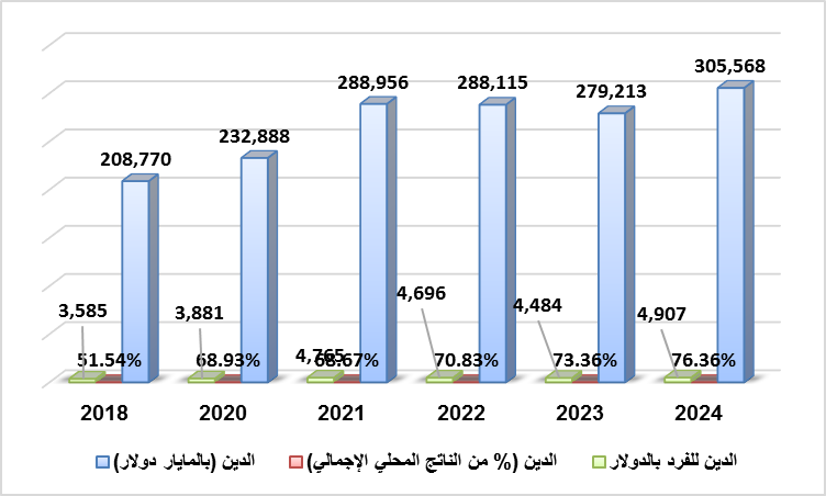 أما بخصوص الديون الخارجية؛ بلغ الدين العام لجنوب أفريقيا 305.568 مليار دولار في عام 2024، وزاد بمقدار 26.355 مليار دولار منذ عام 2023. وقد وصل في عام 2024 إلى 76.36% من الناتج المحلي الإجمالي لجنوب أفريقيا، وهو ما يمثل ارتفاعا بنحو 3 % عن عام 2023، عندما كان 73.36% من الناتج المحلي الإجمالي. ([31]) ويوضح الشكل التالي تطور الديون الخارجية لدولة جنوب افريقيا.