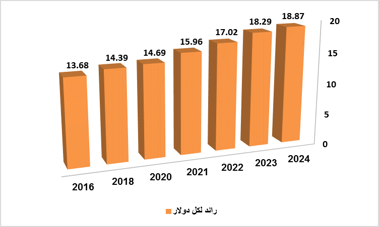 شهد الراند الجنوب أفريقي انخفاضًا ملحوظًا في قيمته خلال العقد الماضي، متأثرًا بالتحديات الاقتصادية المحلية، مثل نقص الكهرباء، وعدم اليقين السياسي، وضعف النمو الاقتصادي. وتفاقم تقلب الراند خلال فترات الضغط الاقتصادي العالمي، ولا سيما خلال جائحة كوفيد-19 عام 2020، ويوضح الشكل التالي أسعار الصرف والتغير فيه في جنوب افريقيا. حيث بلغ نهاية عام ٢٠٢٤، ١٨.٨٧ راند للدولار، مقارنةً بقيمة نهاية عام ٢٠٢٣ البالغة ١٨.٢٩ راند جنوب أفريقي، وسعر الصرف قبل عقد من الزمن والبالغ ١١.٥٧ راند جنوب أفريقي. وبلغ متوسط سعر الصرف ١٥.١٢ راند جنوب أفريقي خلال العقد الماضي. ([35])