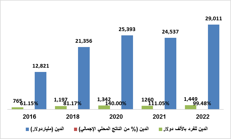 إذا نظرنا إلى الشكل، يُمكننا رؤية تطور ديون زامبيا. فقد ارتفعت منذ عام 2016 من حيث الدين العالمي، حين بلغت 12.821 مليار دولار، وكذلك من حيث نسبتها إلى الناتج المحلي الإجمالي، حين بلغت 61.15%. وفقًا لآخر بيانات منشورة، بلغ نصيب الفرد من الدين في زامبيا 1449 دولارًا أمريكيًا في عام 2022. وفي عام 2021، بلغ 1260 دولارًا أمريكيًا، ثم ارتفع بمقدار 189 دولارًا أمريكيًا.
