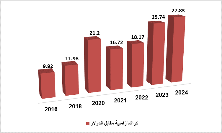 وقد بلغ سعر الصرف في زامبيا 27.83 وون زامبي للدولار في نهاية عام 2024، مقارنةً بقيمة 25.74 وون زامبي في نهاية عام 2023، و6.49 وون زامبي قبل عقد من الزمن. ([46]) ويوضح الشكل التالي أسعار الصرف والتغير فيه في زامبيا.