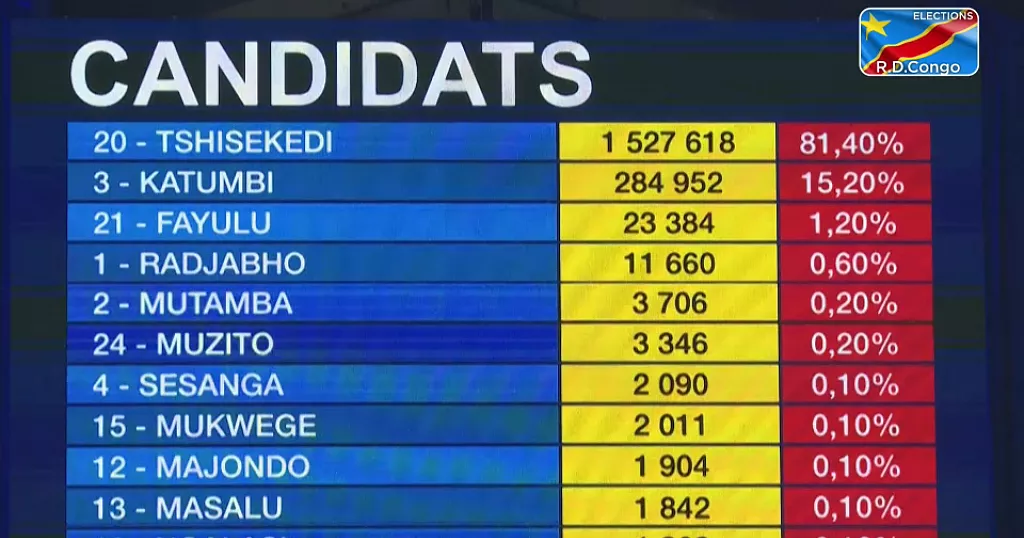 A ce stade du décompte des voix, selon la Céni, Félix Tshisekedi, au pouvoir depuis début 2019 et brigue un second quinquennat, a obtenu un score de 81,4 %.